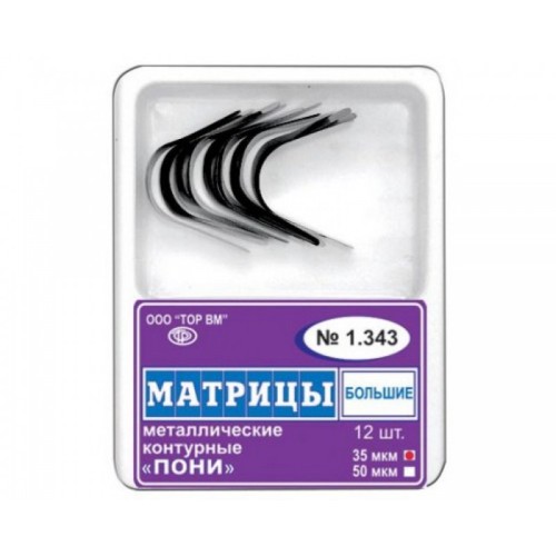 Контурные металлические матрицы Пони 1.343 применяются при реставрациях в тех случаях, когда коронковая часть зуба сильно разрушена. Благодаря специально подобранной длине, они идеально охватывают зуб.