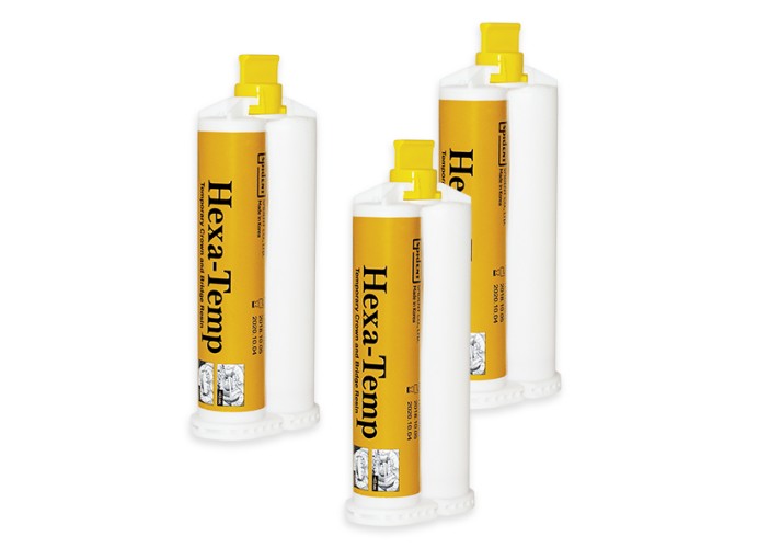 Паста Hexa-Temp поставляется в удобных и безопасных двухкомпонентных картриджах, смешивающих материал через одноразовые канюли. Она быстро затвердевает и успешно полируется, обладает высоким показателем прочности как на сжатие, так и на изгиб.